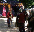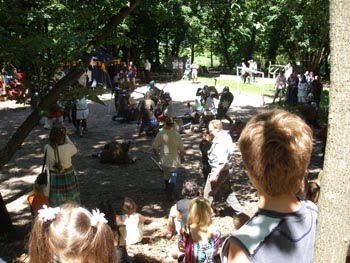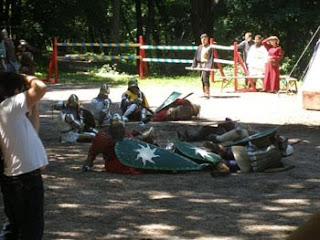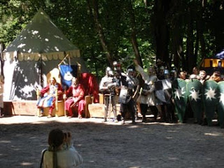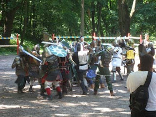 Честно говоря, я дождалась только бугурта (массовое побоище) и уехала. По программе еще должен был быть рыцарский турнир, мастер-класс средневекового танца (было бы интересно, но увы), средневековая музыка и конечно еще бугурты.Наконец участники поделились на команды и начали готовиться к сражению... По ристалищу прохаживался человек в майке и шортах, наверное рефери )))